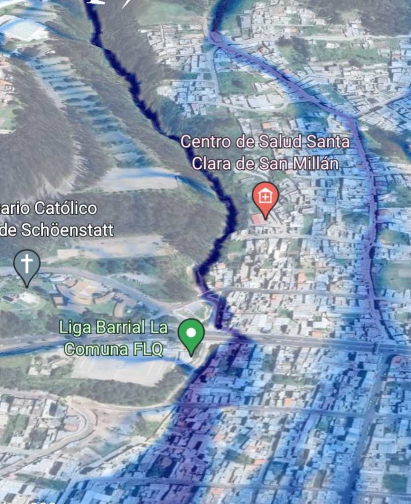 Simulación de inundaciones: barrio La Comuna-Quito ( 28 fallecidos). Esta simulación se realizó con 8 años de anticipación antes de la inundación.
